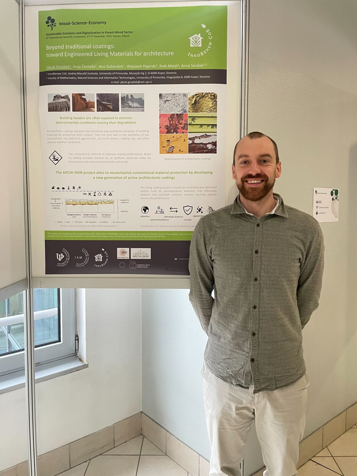 Dr. Grzybek presented the Archi-Skin project with the poster presentation titled “Beyond Traditional Coatings: Toward Engineered Living Materials for Architecture”. Co-authors of the poster are researchers Dr. Anja Černoša, Ana Gubenšek, Dr. Wojciech Pajerski, Dr. Ihab Malat and Dr. Anna Sandak from InnoRenew CoE, UP IAM.